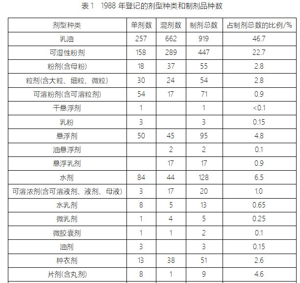 于此同時,1978年改革開放后,國外大量的農藥新劑型、新制劑陸續在我國取得登記。直到1998年美、英、德等20個國家的74家公司在我國登記了500多種(其中衛生制劑137種)農藥,涉及的劑型有干懸浮劑9種、水分散粒劑4種、水乳劑2種、油懸浮劑1種、微膠囊劑1種。國外新劑型進入我國,帶動和促使我國加快農藥新劑型、新制劑的開發。同時加速了我國農藥加工工業的發展,逐步改變我國農藥制劑品種少、質量差、助劑不配套、加工設備落后的狀況,國家在“六五”“七五”期間將農藥新劑型開發列入國家攻關項目。化工部組織沈陽化工研究院、安徽省化工研究院、北京農業大學(現為中國農業大學)應化系、山東農業大學、浙江化工學校、中國農科院植物保護研究所、上海農藥所,以及浙江、四川、湖南、廣西、遼寧、江西、河北、福州等地的44個農藥科學研究院(所)、大專院校、工廠協作攻關,取得農藥劑型加工科技成果150余項,增加了農藥新劑型新制劑品種,乳油產品質量明顯提高,可濕性粉劑的配方、工藝設備和路線有很大突破,使懸浮率提高到60%~80%,一些粒劑和農藥懸浮劑、微膠囊劑、水乳劑、微乳劑等新劑型、新制劑投放市場。國家攻關項目的完成,培養和造就了一支農藥制劑開發專業隊伍,這是我國農藥劑型加工工業發展史上的關鍵一步,推動了我國農藥劑型工業快速發展。到20世紀80年代末期我國登記的農藥原藥195種,農藥劑型31種,農藥制劑1970種(見表1),使我國原藥和制劑之比由“七五”期間的1∶3上升到1∶10。農藥劑型結構發生了很大變化,粉劑大幅下降到3%,乳油迅速上升至46.7%。