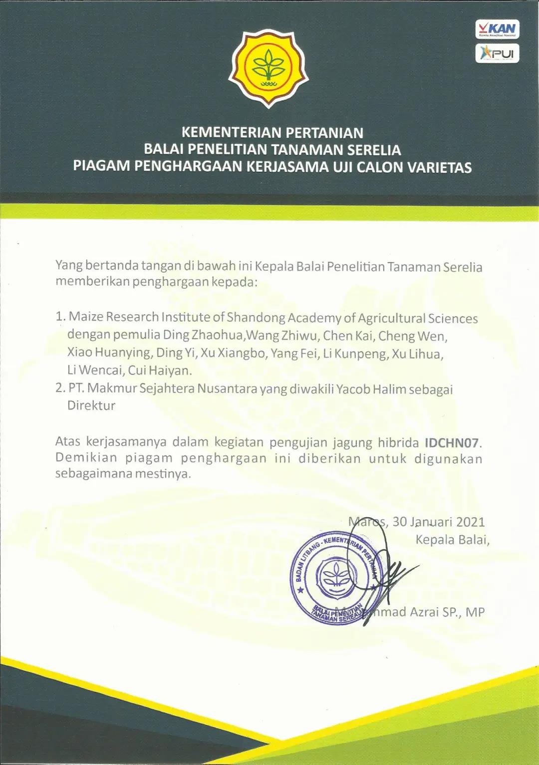 “該新品種高抗印度尼西亞主要病害‘玉米霜霉病’,在印尼國家審定試驗中,平均產(chǎn)量折合畝產(chǎn)793.34公斤,比第1對照品種Bisi18(印尼主推品種)平均增產(chǎn)8.28%,比第2對照品種P36(最新審定的跨國公司品種)平均增產(chǎn)7.31%,居所有參試品種第一位。”