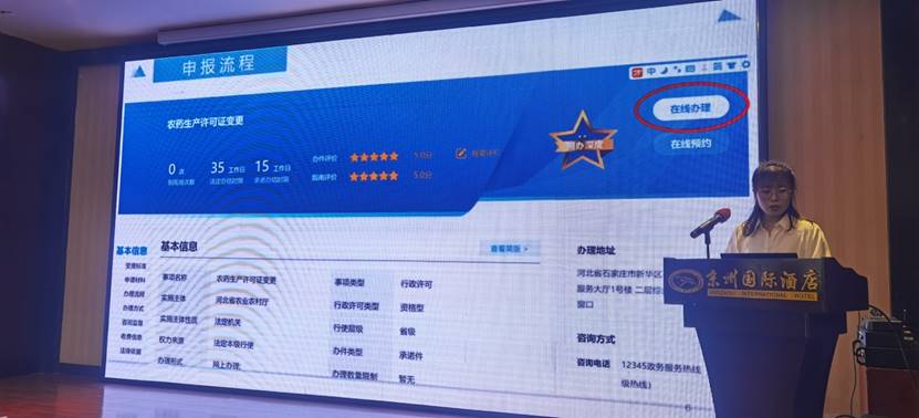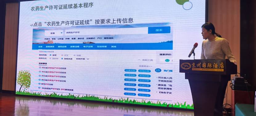 河北省農(nóng)藥檢定監(jiān)測總站高夢琪科長為大家詳細講解了申報流程、農(nóng)藥生產(chǎn)經(jīng)營許可申報常見問題及限制使用農(nóng)藥經(jīng)營許可延續(xù)有關(guān)要求。