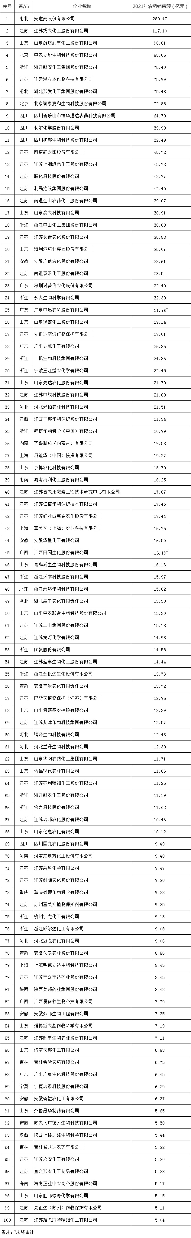 7月7日,浙江紹興,2022全國農(nóng)藥行業(yè)銷售TOP100在第九屆農(nóng)藥行業(yè)經(jīng)濟(jì)運(yùn)行分析會暨2022農(nóng)藥行業(yè)名單發(fā)布會上揭曉,其中安道麥股份有限公司銷售額達(dá)280.47億元,位居首位,江蘇揚(yáng)農(nóng)化工股份有限公司銷售額達(dá)117.10億元,山東濰坊潤豐化工股份有限公司銷售額達(dá)96.81億元。
