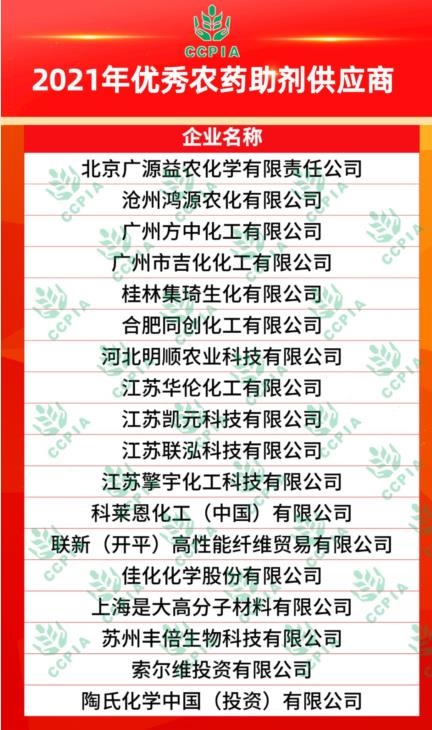 優秀的供應商,是農藥行業持續發展的強引擎之一。2021年,共計37家企業入選農藥行業優秀供應商名單,其中索爾維、聯新(開平)、陶氏化學、廣源益農、方中化工等18家企業進入2021年優秀農藥助劑供應商名單;河北誠信、河北亞諾、中化藍天等10家企業進入2021年優秀農藥中間體供應商名單;金旺智能、湯姆智能、昆山博瑞凱等9家企業進入2021年優秀農藥設備供應商名單