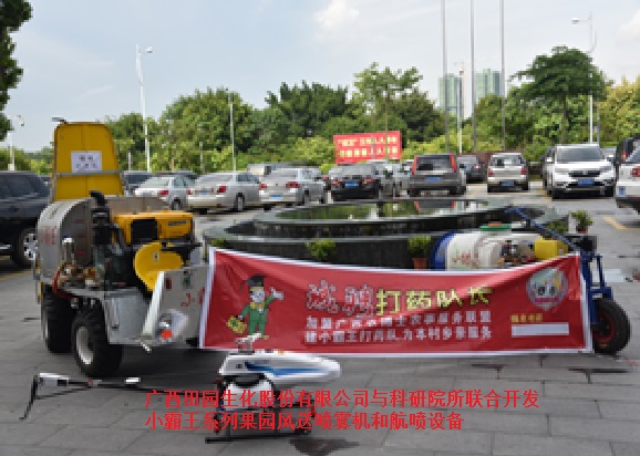 廣西田園生化股份有限公司與科研院所聯合開發的小霸王系列果園風送噴霧機和航噴設備,先進高效,正逐漸受到果農們的青睞。該套設備同時來到了會議現場,吸引了大部分參會人員的目光。