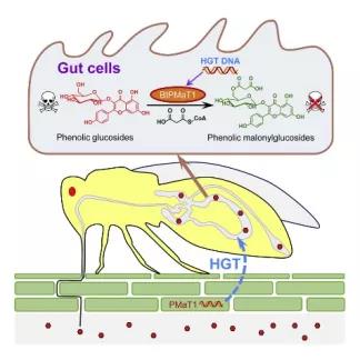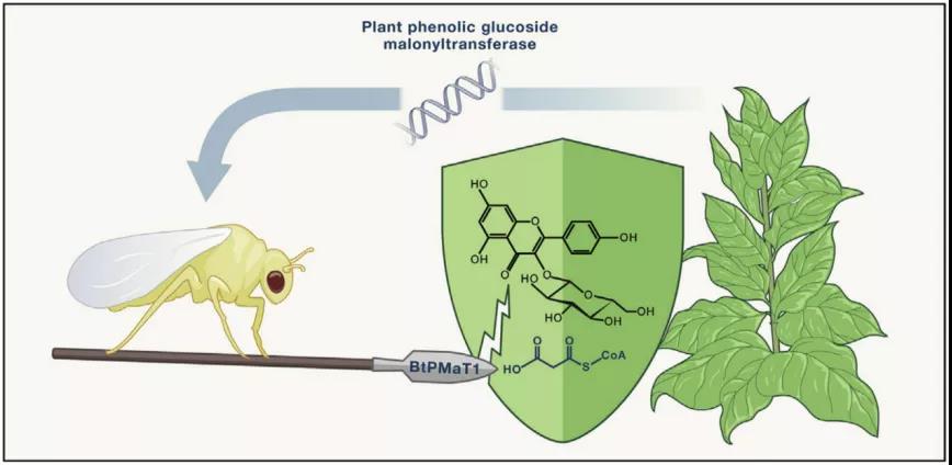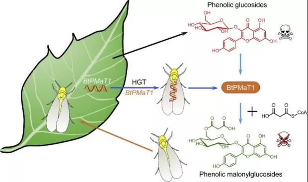 這本是一個(gè)非常巧妙的方法,可百密一疏,最重要的解毒劑配方,編碼酚苷丙二酰轉(zhuǎn)移酶的基因BtPMaT1,卻被蚜蟲的親戚,體長不過1毫米的小蟲--煙粉虱,偷走放進(jìn)了自己的基因組中,世代傳承。