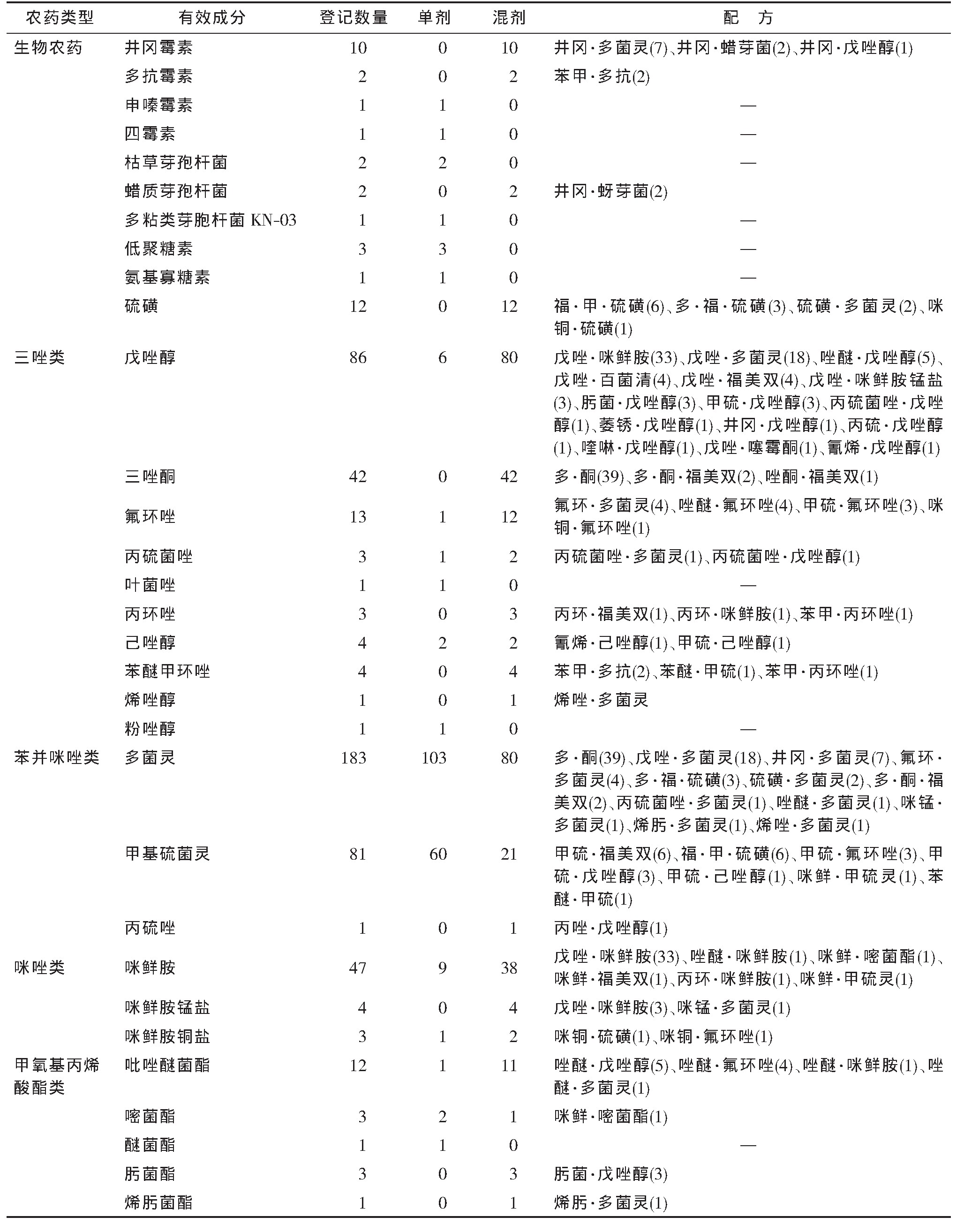 表1我國登記用于小麥赤霉病防治的農藥品種有效成分及配方數量