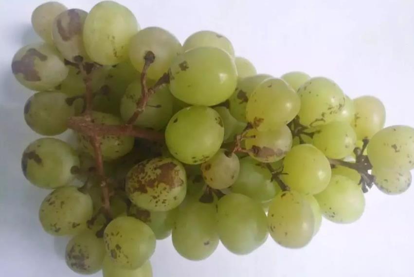 葉片受害時會出現褐色斑塊,葉片反卷、多皺褶,嚴重時散生黑色污漬,易干枯脫落。果實受害時表面有銹狀污點,著色不佳,易裂;穗軸、果梗發黑易斷。