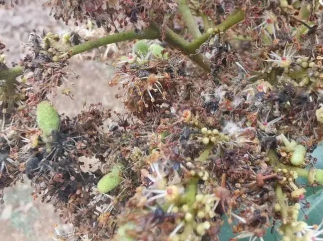 荔枝霜疫霉病,病原為荔枝霜疫霉菌,屬鞭毛菌亞門的一種真菌,其無性繁殖產(chǎn)生病原孢子囊?;ㄋ敫胁『笞兒指癄€,病部有白色霉?fàn)钗铮还麑?shí)最易在成熟前感病,初期出現(xiàn)褐色病斑,開裂,嚴(yán)重時(shí)全果變褐,后期果肉發(fā)酸、糜爛,流出褐色汁液,容易脫落,當(dāng)濕度高時(shí),病部長(zhǎng)出白色霉層。