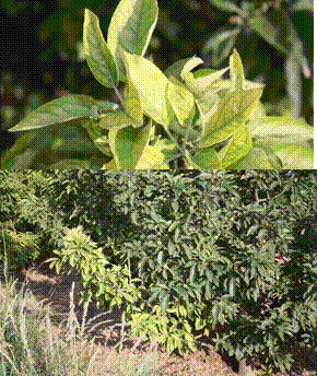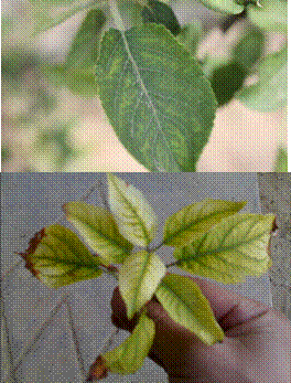 •新梢頂端的幼嫩葉變黃綠,再變黃白色,葉脈仍為綠色,呈綠色網(wǎng)紋狀。