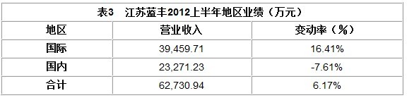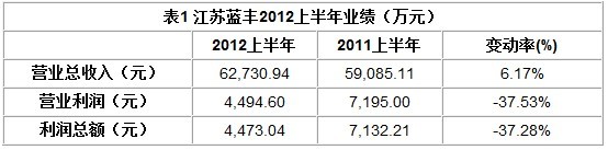 江蘇藍豐生物化工股份有限公司近日公布2012上半年度業績報告。2011年,江蘇藍豐實現營業收入62,730.946萬元,比去年同期增加6.17%。營業利潤為4,494.60萬元,同比下降37.53%;利潤總額為4,473.04