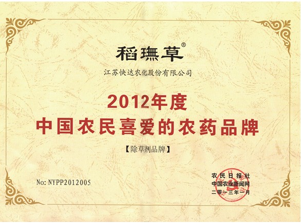 -----“稻璑草”被授予江蘇省著名商標,同時喜獲2012中國農民最喜愛的農藥除草劑品牌五強