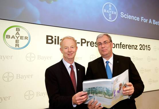 Marijn Dekkers博士與拜耳首席財務官Johannes Dietsch共同展示2014年拜耳集團年度財報
