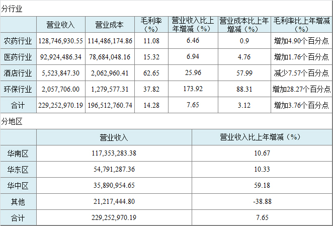 農(nóng)藥行業(yè)主營業(yè)務(wù)收入同比增加了6.46%,主要原因是:控股子公司湖南國發(fā)及時根據(jù)市場需求調(diào)整農(nóng)藥產(chǎn)品結(jié)構(gòu),大力拓展國內(nèi)銷售渠道,使其農(nóng)藥銷售業(yè)務(wù)同比增長,致使華中地區(qū)銷售收入增加較大,因出口的農(nóng)藥產(chǎn)品品種相對較為單一,受市場需求影響相對較大,湖南國發(fā)公司的出口業(yè)務(wù)繼續(xù)下降,出口收入減少,致使其他地區(qū)銷售收入同比減少。