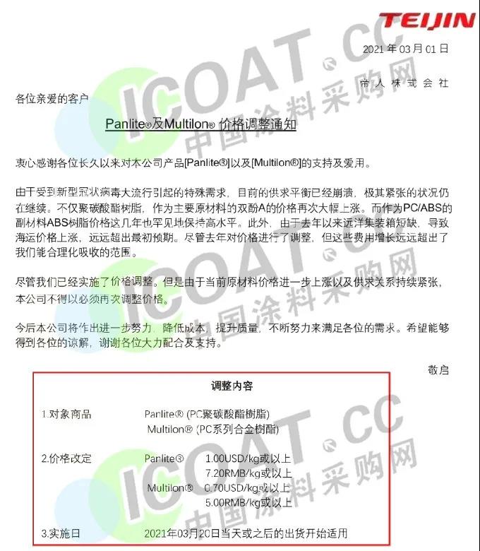 帝人株式會社發函,稱因為目前供需平衡混亂,原料供應極其緊張,作為原料的聚碳酸酯樹脂、雙酚A等價格的大幅度上漲,以及去遠洋集裝箱的短缺、海運價格上漲等客觀原因,不得不再次調整產品價格。