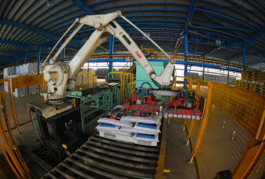 大峪口五大裝置開足馬力奮戰生產,8臺“機械手臂”將一包包化肥整齊地碼在托盤上。
