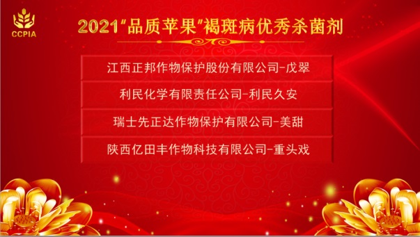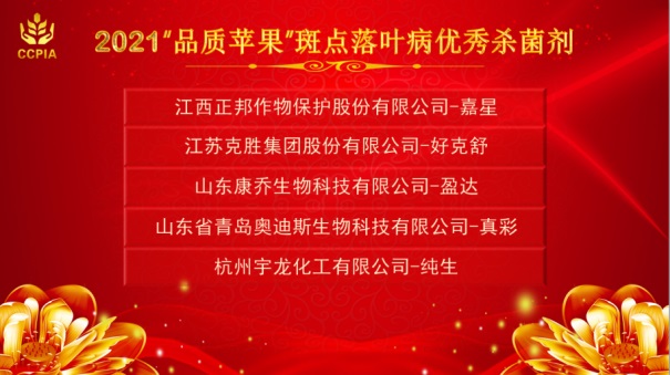 會議期間還舉行了2021“品質蘋果”優質植保產品及方案發布儀式,正邦作物產品“戊翠”和“嘉星”分別榮獲2021“品質蘋果”褐斑病優秀殺菌劑和2021“品質蘋果”斑點落葉病優秀殺菌劑。期待正邦作物更多的優秀植保產品及方案在蘋果上得以應用,進一步推動蘋果產業改良提質增效,助力鄉村振興。