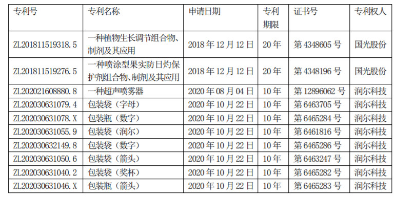 4月15日國光股份發布公告稱,近日,中華人民共和國國家知識產權局授予四川國光農化股份有限公司及全資子公司四川潤爾科技有限公司2件發明專利、1件實用新型專利、7件外觀設計專利,具體情況如下: