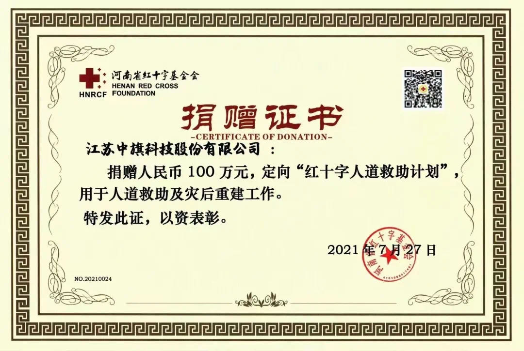 “一方有難,八方支援”是中華民族的優良傳統。7月27日,江蘇中旗科技股份有限公司通過向河南省紅十字基金會捐贈人民幣100萬元,定向“紅十字人道救助計劃”,用于人道救助及災后重建工作。