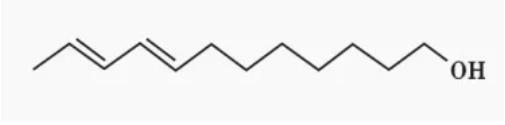 活性成分:反-8,反-10-十二碳二烯醇,(E,E)-8,10-dodecadien-1-ol,codlemone;CAS號(hào):33956-49-9;分子式:C12H22O;相對(duì)分子質(zhì)量:182.3。理化性質(zhì):熔點(diǎn)32℃,閃點(diǎn)(78.8±17.1)℃,沸點(diǎn)(216.8±9.0)℃/760 mmHg,蒸氣壓168 mPa/25℃,折射率1.4282/20℃。溶解度(20℃):水中25.48 mg/L,易溶于有機(jī)溶劑,在常溫常壓下貯存穩(wěn)定。結(jié)構(gòu)式: