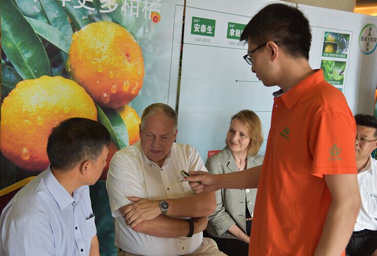 Holdger Willms博士:拜耳公司通過與政府、公共事業(yè)部門、藥械公司以及種植戶合作的方式,從“更多水稻”項(xiàng)目開始,目前已經(jīng)做了“更多水稻”、“更多小麥”等項(xiàng)目,現(xiàn)在拜耳公司在果樹上又推出“更多柑橘”項(xiàng)目。因?yàn)榘荻诟涕偕嫌幸恍﹦?chuàng)新性的產(chǎn)品,比如畝旺特、露娜潤(擴(kuò)作中),它們有一些獨(dú)特的作用機(jī)理。拜耳公司在柑橘主產(chǎn)地區(qū),尤其是在廣西、江西做了很多示范項(xiàng)目。