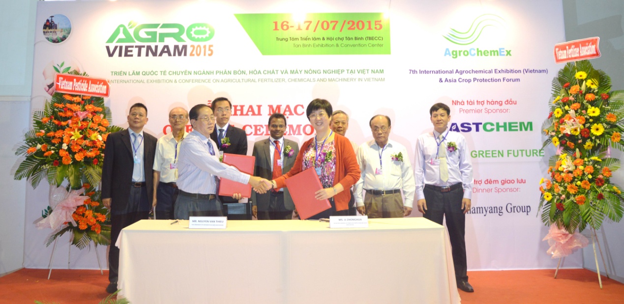 由中國農藥工業協會、中國化工信息中心聯合主辦的“第七屆國際農業展覽會暨亞洲植保高峰論壇”在越南農業部、越南工業和貿易部的大力支持下,于2015年7月16日在越南胡志明市正式拉開帷幕。出席本次開幕式的嘉賓包括越南工業貿易部貿促局副局長培氏清安女士,越南工業貿易部南部事務局副局長黎玉鐘先生,越南農業部植保局副局長陳春釘先生,越南農業部農藥管理處處長黃金達先生,越南農藥協會主席陳光興先生,越南農藥協會副主席阮文山先生,越南化肥工業協會副主席阮丁黑水先生,印度駐胡志明市總領事館領事Mr. Manoj Kumar,柬埔寨農業部Rida女士,泰國農商聯合會主席Weerawooth Katanyukul博士和中國農藥工業協會秘書長李鐘華博士。在越南農業部、越南工業和貿易部領導的見證下,中國農藥工業協會和越南農藥協會現場簽署了戰略合作協議,旨在共同推動中越農化行業和企業貿易交往安全、公平、誠信地開展,加強中越農化技術信息交流,共同尋求確保農藥產品市場的可持續發展的路徑。開幕式結束后,各位嘉賓在主辦單位的陪同下,參觀展廳,與展商親切交流并合影留念。