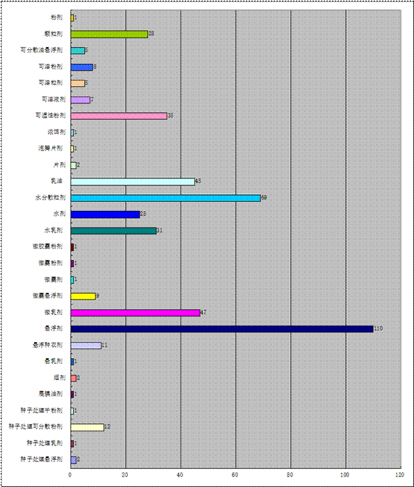 其中懸浮劑是登記最多的劑型、其次是水分散顆粒劑和微乳劑、乳油、可濕性粉劑、水乳劑、水劑等,微膠囊懸浮劑等產品登記數量仍比較少。在復配制劑中所體現的情況與單劑相類似,同樣是懸浮劑為最多登記劑型。