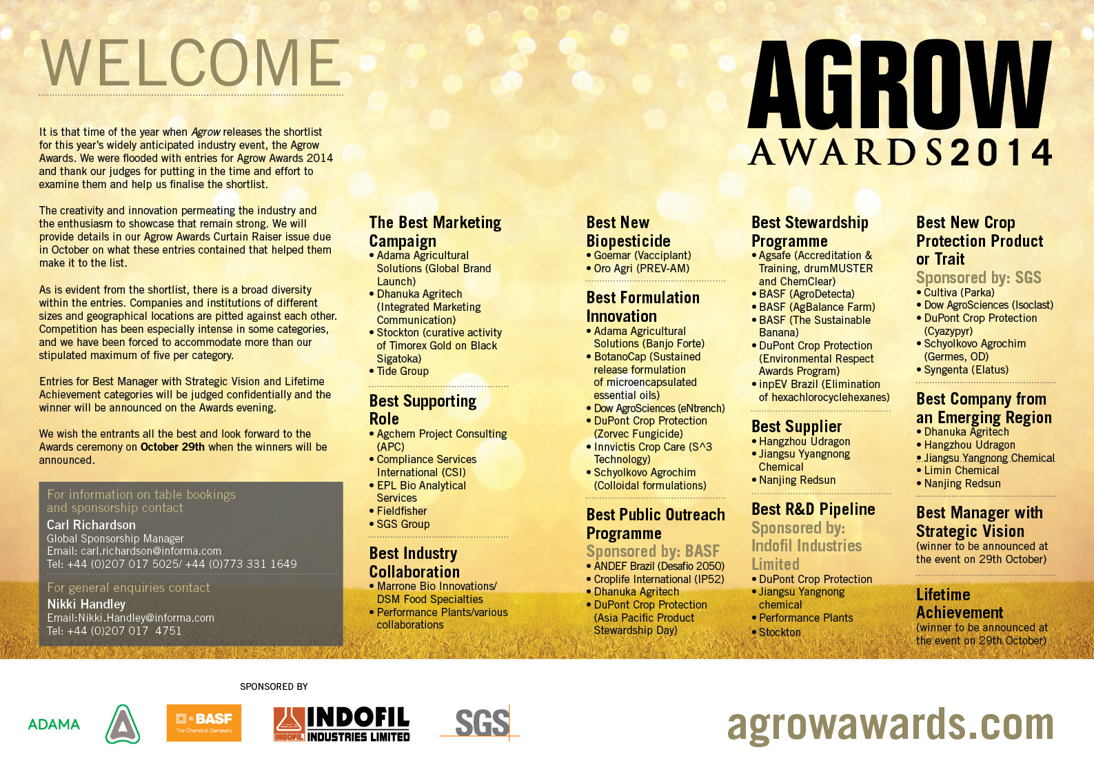 一年一度的Agrow Awards評選活動如火如荼,獎項候選名單已經揭曉,其中五家中國農藥企業入圍,最終花落誰家,拭目以待(見下表):