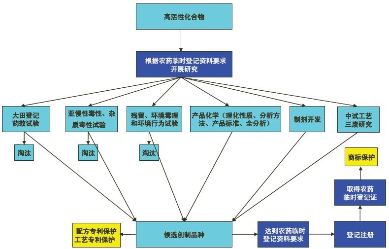 大田實驗、毒性試驗、環境試驗將淘汰大部分化合物,在所有這些試驗都通過之后,就能得到候選的創制品種。這些候選創制品種在達到農藥臨時登記要求后可進行登記注冊工作,取得農藥臨時登記證。
