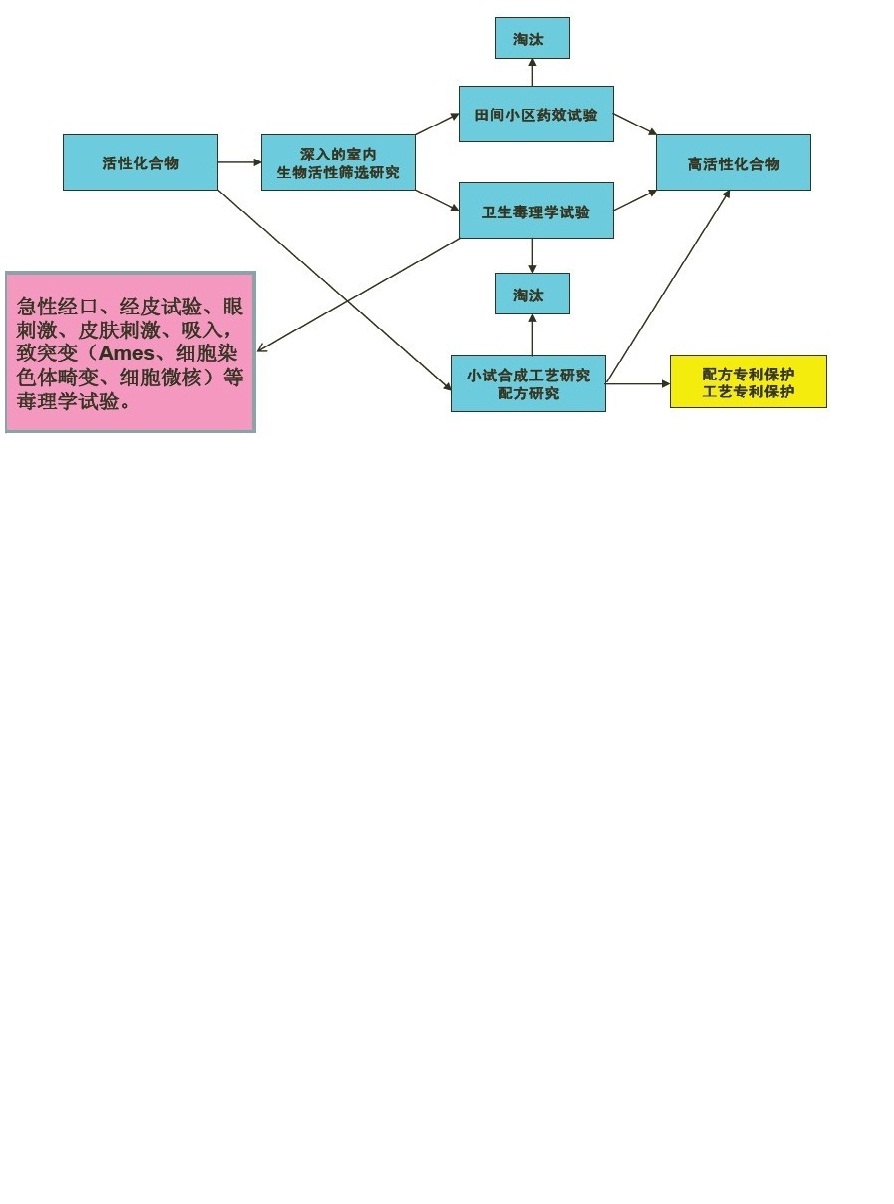 衛生毒理學試驗內容涵蓋急性經口、經皮試驗、眼刺激、皮膚刺激、吸入、致突變等內容。經過這些試驗,有大部分化合物會被淘汰,留下來的化合物進行小試合成工藝研究和配方研究。小試或者配方研究又會淘汰部分化合物,最后得到小試合格之后的高活性的化合物。