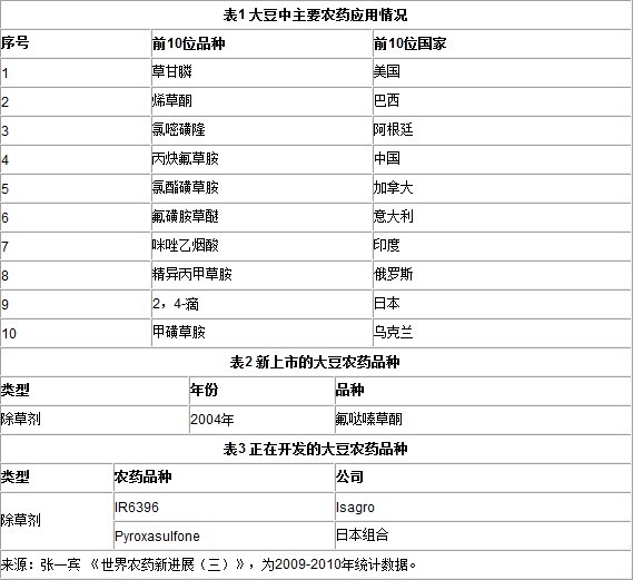 全球大豆種植面積0.98億公頃,美國占31.6%,巴西21.9%,阿根廷17.0%,印度9.8%,中國9.0%,加拿大1.4%,印尼0.6%,其余國家和地區(qū)8.7%。大豆農(nóng)藥應用情況如下表: