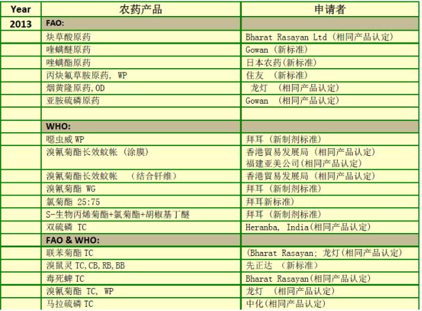 相同產品認定需求快速增長。近年來生產專利過期產品的農藥企業申請國際相同產品認定不斷升溫,從2002 年的17%上升到2012年的85%。申請產品主要集中在菊酯類殺蟲劑(氯氰菊酯、溴氰菊酯、氯菊酯、高效氯氰、高三氟氯氰菊酯、聯苯菊酯)、毒死蜱 和殺菌劑嘧菌酯、乙磷鋁、代森錳鋅、甲基托布津以及除草劑草甘磷、甲磺隆、煙嘧磺隆、噻磺隆、苯磺隆等。