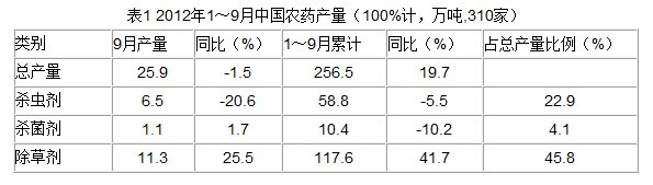 2012年1~9月,受除草劑產量大幅增長的拉動,全國累計生產農藥256.5萬噸,同比增長19.7%,實現了連續多個季度兩位數的增長。