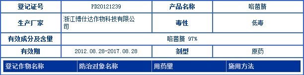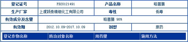 近日,上虞穎泰精細化工有限公司取得咯菌腈原藥(98%)正式登記,成為國內第二家取得該原藥登記的公司。截止目前,還有浙江博仕達作物科技有限公司和瑞士先正達作物保護有限公司分別持有該原藥97%和95%含量的正式登記。