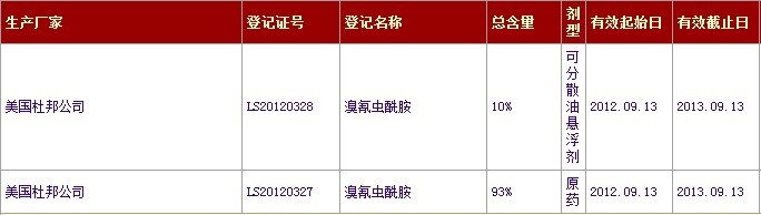9月13日,美國杜邦公司的殺蟲劑原藥溴氰蟲酰胺獲ICAMA臨時登記,順利實現杜邦公司對該原藥在亞洲獲取首次登記的愿望。同時,杜邦公司該產品的可分散油懸浮劑也獲得了臨時登記。