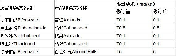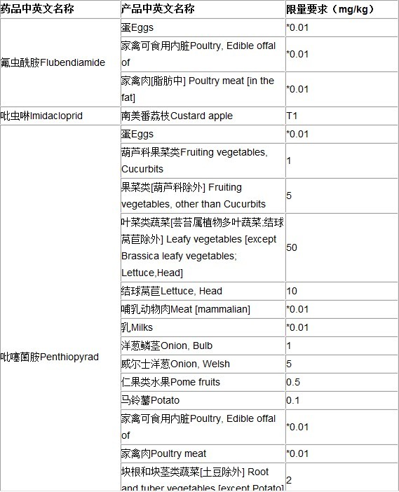 2012年9月11日,澳大利亞農藥和獸藥管理局發布公報,對食品和飼料中農獸藥的殘留限量做了修訂。 1.修訂以下限量要求: