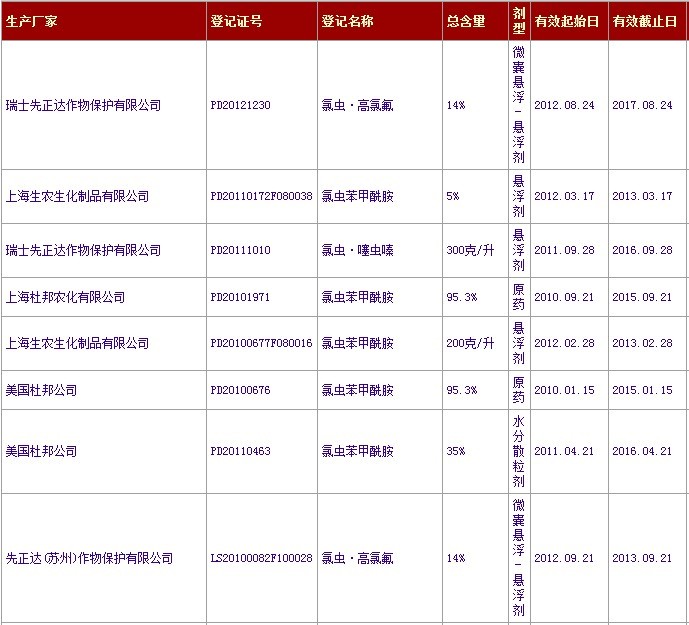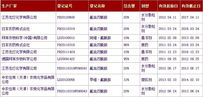 已獲得農藥登記證書的氟蟲雙酰胺和氯蟲苯甲酰胺產品信息: