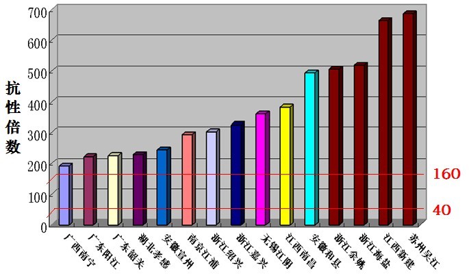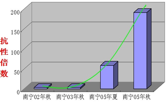 下圖為2005年10月褐飛虱對吡蟲啉抗性監測結果: