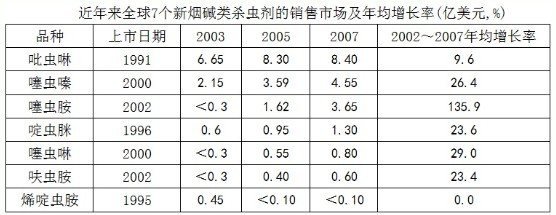 在新煙堿類殺蟲劑中,以噻唑基替代吡啶基的品種值得關注。此類三個品種2002~2007年的年均增長率,在此類品種中居前三位。