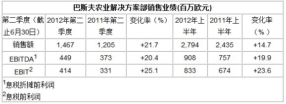 巴斯夫日前公布了其農業解決方案部門2012財年第二季度的(截止6月30日)銷售業績。由于北半球銷售的強勁增長,銷售額同比去年增長了21.7%,達14.67億歐元;息稅前利潤(EBIT)上升25.1%,為4.14億歐元;息稅折攤前利潤(EBITDA)上升20.4%,為4.49億歐元。銷量、價格和貨幣的增長都對銷售的上升產生有力影響,分別增長了14%,2%和6%。