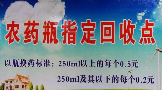為了真正做到源頭治污,新建鄉黨委政府想出了這個舊瓶換新藥的好點子。4月22日,該鄉動員9家農資連鎖店,在全鄉15個村場展開廣泛宣傳,對容量為250毫升以上及以下(含)的農藥瓶分別以每個0.5元和0.2元價格實行回收,或等價換農藥,回收時間不限。此外,該鄉還積極協助各回收點及時聯系農藥生產廠家,或通過廢品收購站,使空舊農藥瓶得到合理利用。
