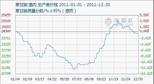 如圖所示,11年草甘膦原藥的均價基本在23000元/噸左右。特別是后半年,隨著國內草甘膦出口退稅政策取消和人民幣升值,導致部分企業出口壓力增加,部分原藥廠家降低了開工率,原藥庫存較少。加之國內一些自然災害,導致原料黃磷的價格迅速上漲,致使草甘膦原藥價格后半年有一個明顯上升的趨勢。但是草甘膦制劑產品的價格,市場價格拼殺激烈,使廠家只能靠降低利潤來維持草甘膦制劑的銷售價格,保持市場占有率,這種方式對于草甘膦制劑生產企業來講實在是無奈之舉,微薄的利潤在刨掉銷售費用后甚至入不敷出,但又不舍得放棄,正如雞肋,“食之無味,棄之可惜”。企業要想發展,必須要有利潤做保障,因此,草甘膦制劑廠家只有一條路可走,就是提高毛利,只做高端!怎么來做?是擺在我們面前的最大難題。