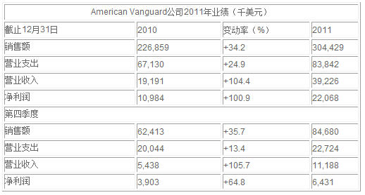 去年,Amvac公司的出口增長了62%,主要在歐洲,中美洲和亞洲實(shí)現(xiàn)增長,但由于五氯硝基苯的短缺,導(dǎo)致加拿大市場銷售額下降。受到生產(chǎn)狀況改善以及銷售額增長的帶動(dòng),Amvac公司2011年毛利率達(dá)到了40%,去年同期為38%。總的營業(yè)開支上升了近1/4,達(dá)到8380萬美元。增長主要是由于新近收購產(chǎn)品的攤分費(fèi)用,以及較高的產(chǎn)品庫擴(kuò)大帶來的開支,包括銷售、管理及技術(shù)員工擴(kuò)招帶來的費(fèi)用。然而,公司指出,營業(yè)支出占銷售額的比例從2010年的30%下降到2011年的28%。營業(yè)收入翻番,達(dá)3920萬美元,凈利潤也翻了一番多,達(dá)到2210萬美元,Amvac的四家美國生產(chǎn)工廠高效運(yùn)行,與上一年相比,占據(jù)了更多的固定成本折舊。