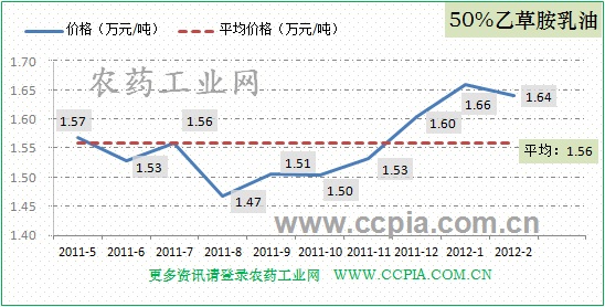 50%乙草胺乳油2月均價為1.64萬元/噸,據中國農藥工業網數據統計,本月銷量在270噸左右,與1月份240噸的產量略有上升。