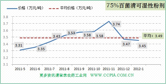 75%百菌清可濕性粉劑去年下半年一路走高,1月份均價為3.45萬元/噸。價格走勢如下圖。