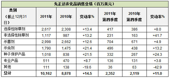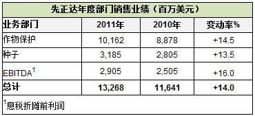 2011年全年植保業務息稅折攤前利潤達24.76億美元,增長了12.9%。營業收入達19.06億美元,增長了9.7%。息稅折攤前利潤率從24.7%下降到24.4%。