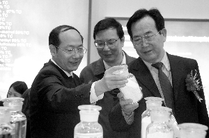2011年11月19日,第十一屆全國(guó)農(nóng)藥交流會(huì)在上海召開(kāi)。 圖為海利爾藥業(yè)集團(tuán)總裁楊波濤(中)向農(nóng)業(yè)部農(nóng)藥檢定所副所長(zhǎng)葉紀(jì)明(左一)和中國(guó)農(nóng)藥工業(yè)協(xié)會(huì)高級(jí)顧問(wèn)、原化工部規(guī)劃院院長(zhǎng)尹儀民(右一)介紹公司的高效低毒農(nóng)藥粉劑。 (王玉東 攝)