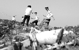 二○一一年十月二十八日,有媒體報(bào)道珠海菜農(nóng)向蘿卜噴施禁用的高毒農(nóng)藥。珠海市高新區(qū)管委會(huì)高度重視,立即組織專責(zé)小組到那洲、永豐蘿卜田抽取了二十六份蘿卜樣本進(jìn)行定性定量檢測(cè)。十一月一日,檢測(cè)結(jié)果顯示,抽取的二十六份樣本中,有十一份樣本呈陽(yáng)性,即含有甲拌磷。十一月二日下午,執(zhí)法部門到現(xiàn)場(chǎng)將查出使用了上述農(nóng)藥的“毒蘿卜”進(jìn)行銷毀。圖為銷毀現(xiàn)場(chǎng)。 (CFP供圖)