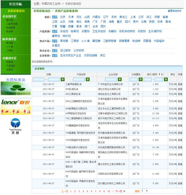 農藥價格動態欄目今日正式上線開通了,注冊會員后,您即可免費查詢實時的農藥市場價格動態,針對大宗農藥產品,還會陸續有市場趨勢預測、行情分析總結等功能,歡迎及時關注!新欄目簡單介紹如下: 欄目鏈接:http://www.scwushuichulishebei.com/price_news.asp 1、農藥企業每日報價,并配合強大的搜索功能,方便用戶查詢。 2、大宗產品市場行情分析 3、市場快訊,及時把握企業動態 感謝您對中國農藥工業網的關注和支持,我們將不斷豐富和完善會員服務功能,為您提供更貼心、方便的服務。如有其它疑問,請致電中國農藥工業網咨詢電話010-84885067。