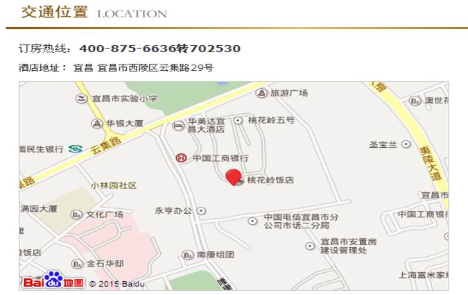 桃花嶺飯店(地址:湖北省宜昌市西陵區(qū)云集路29號,電話:400-875-6636轉702530),會議房價450元/間.天。