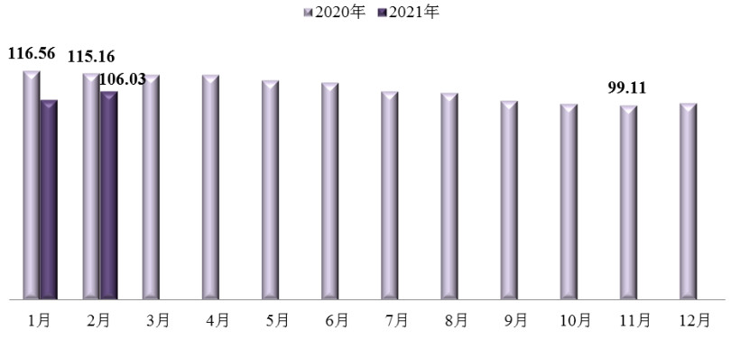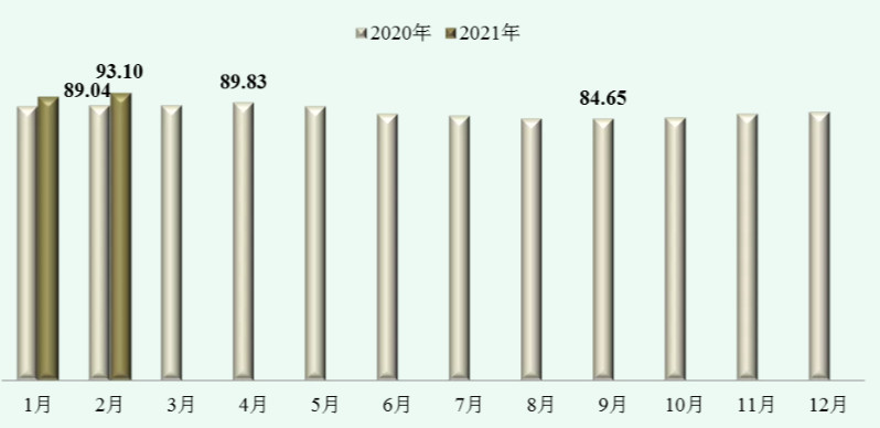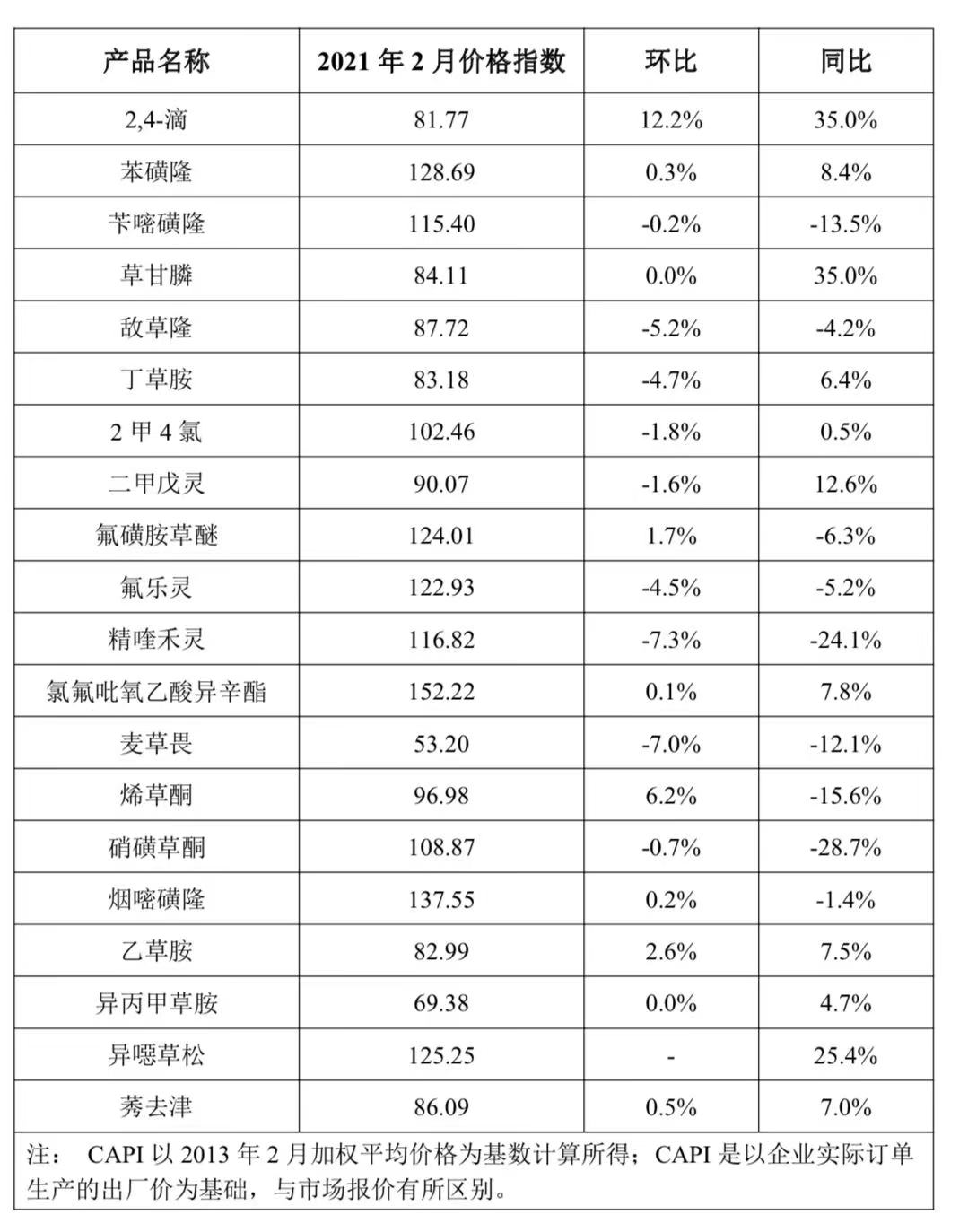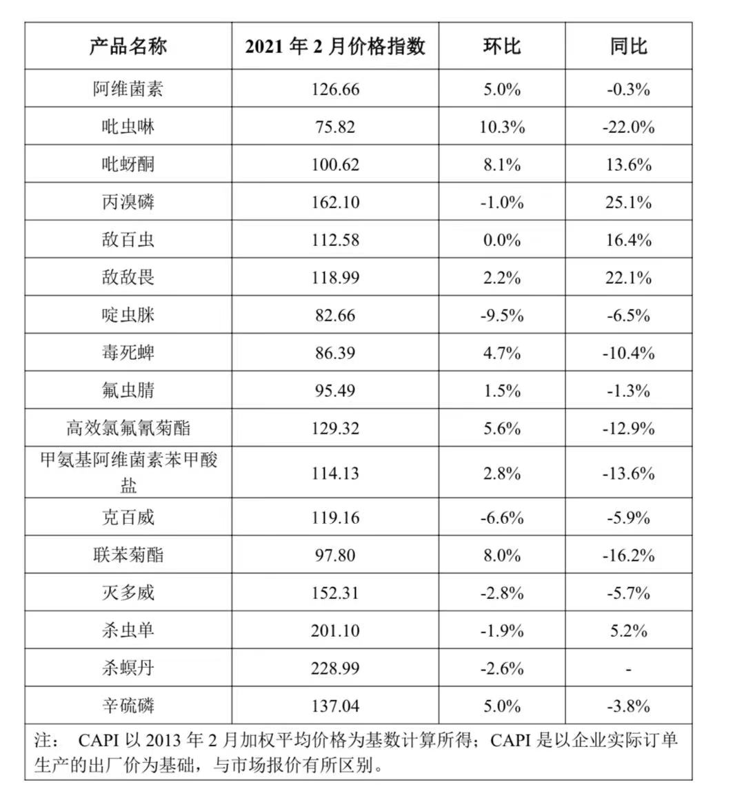 2021年2月,中國農(nóng)藥價格指數(shù)繼續(xù)上揚。據(jù)中國農(nóng)藥工業(yè)協(xié)會統(tǒng)計,2月農(nóng)藥價格指數(shù)(CAPI)為93.10,環(huán)比上漲1.56%,同比上漲4.56%。