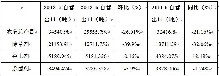原藥產品企業自營出口方面,2012年6月出口總量為25555.798噸。6月環比呈下降趨勢,其中除草劑下滑較為嚴重。與去年同期相比除殺蟲劑以外,各產品均出現不同程度下降。殺蟲劑自營出口6月與5月基本持平,同比上漲18.18%。