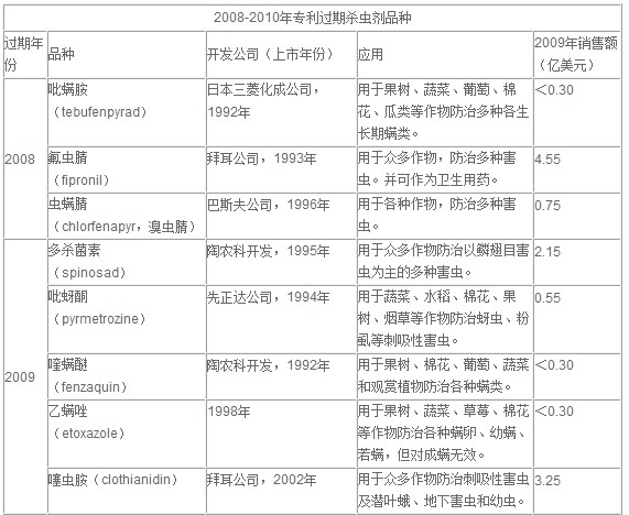 2010年全球農藥市場為441.95億美元,其中作物保護為383.15億美元,占86.70%;非農用為58.8億美元,占13.30%。在441.95億美元農藥市場中,專利保護期產品占30%,為132.59億美元。非專利產品占27.5%,為121.54億美元。過專利期產品(指原藥)占42.5%,為187.83億美元。由此可見,目前過專利期產品農藥的主要市場。若加入非專利農藥產品市場,則占70%,為309億美元以上。下表為2008年~2011年到期的農藥品種及其市場情況。